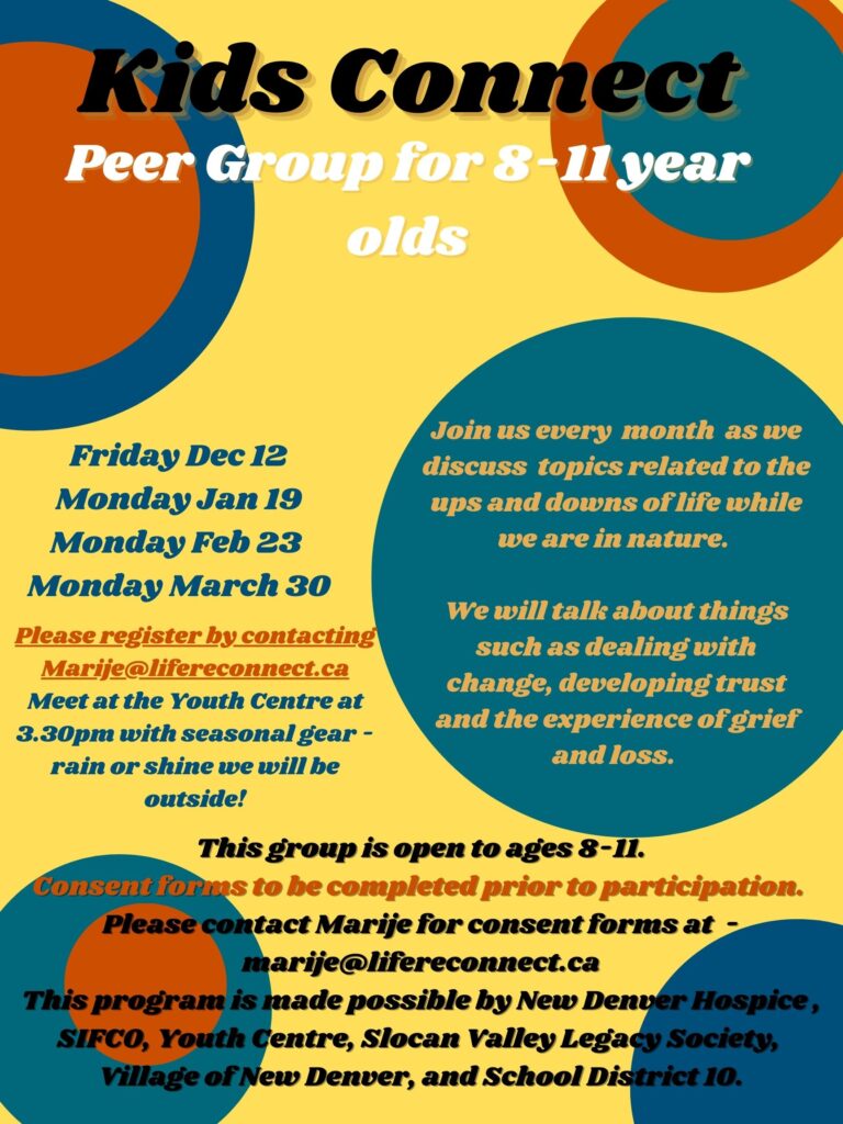 Are you 8-11 years old?  Join us for out Kids Connect group every month as we discuss topics related to the ups and downs of life while we are in nature. Nature teaches us how we can navigate some challenging times. We will talk about things such as dealing with change, developing trust and the experience of grief and loss. Please RSVP as spots are limited depending on location. We will always go outside, so dress for the weather!